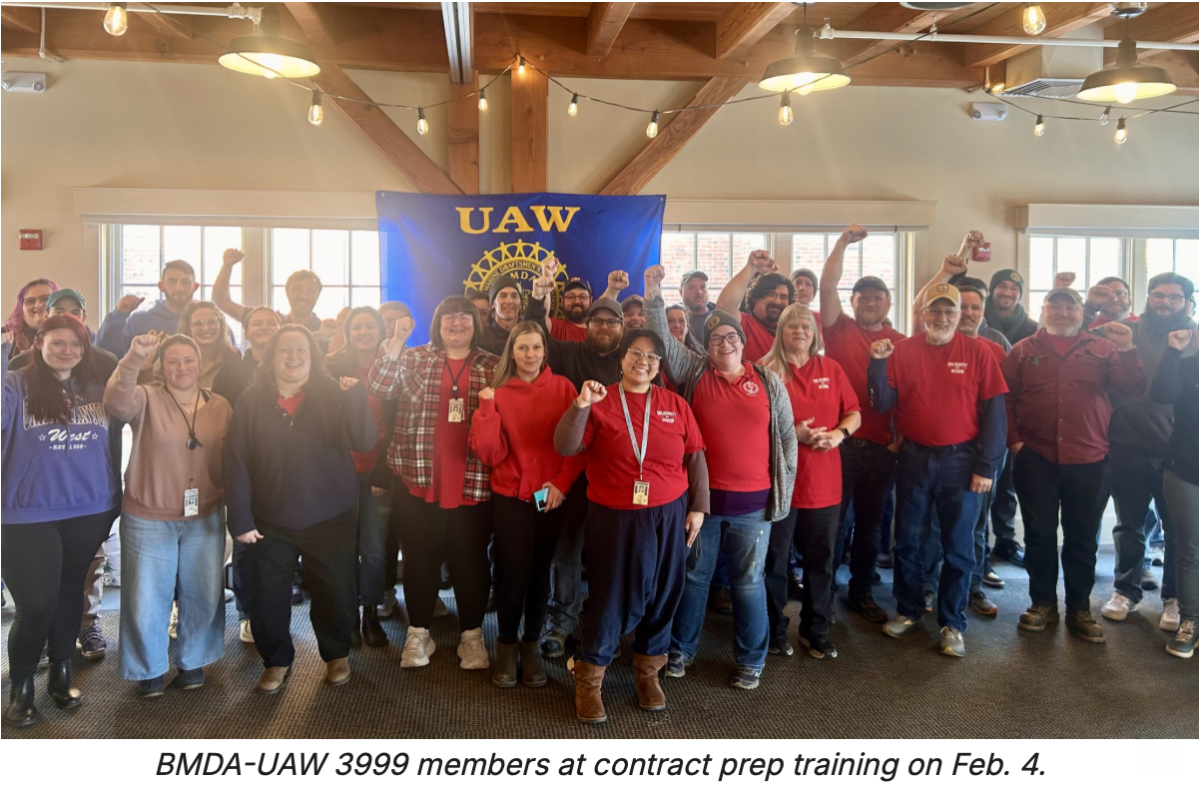 For the past three months, the Bath Marine Draftsmen’s Association (BMDA – UAW 3999) has been preparing members for negotiations with Bath Iron Works - General Dynamics on a new contract. UAW Region 9A and the Maine AFL-CIO have held sessions with BMDA members to do trainings on the negotiations process, strike preparation, internal organizing and communications. Over 50 members showed up for the training in December.