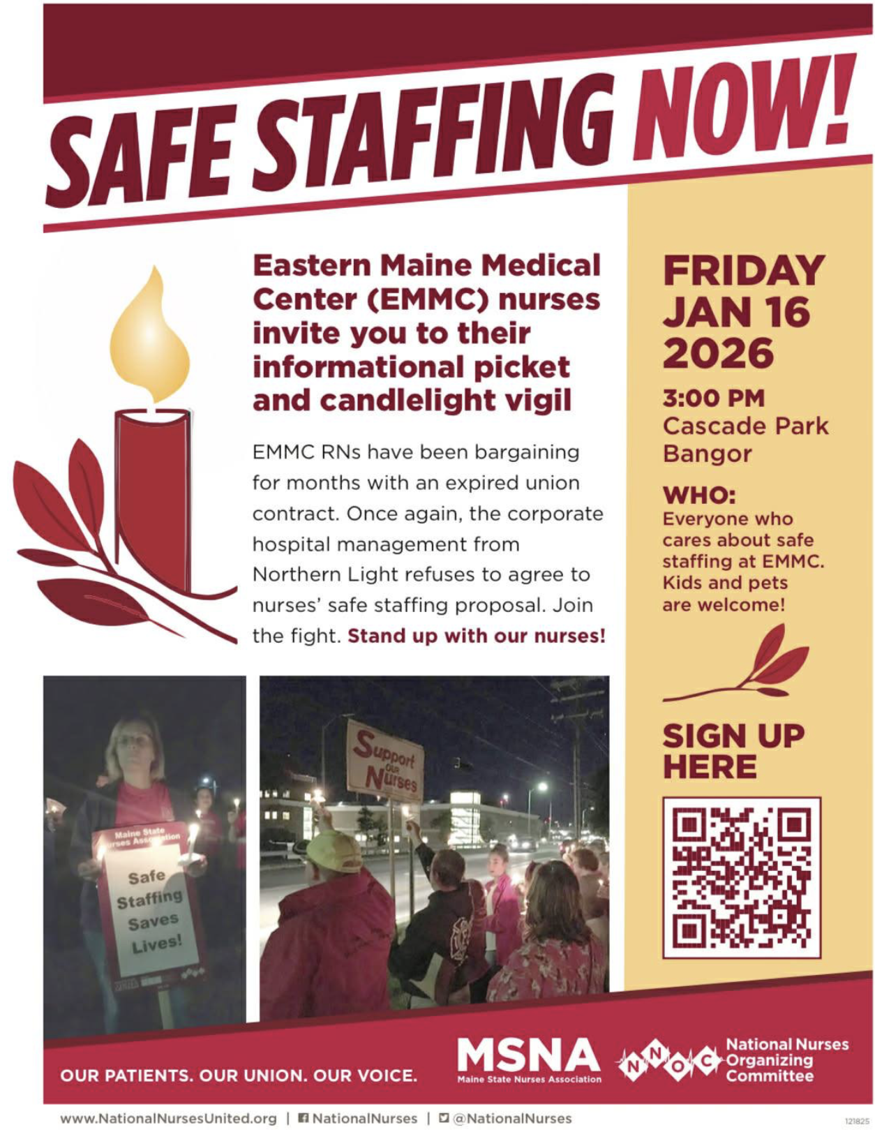 Nurses at Eastern Maine Medical Center are in the middle of contract negotiations and fighting to protect patient safety. Please join us in supporting them for a informational picket and candlelight vigil on Friday, Jan 16 at Cascade Park in Bangor.