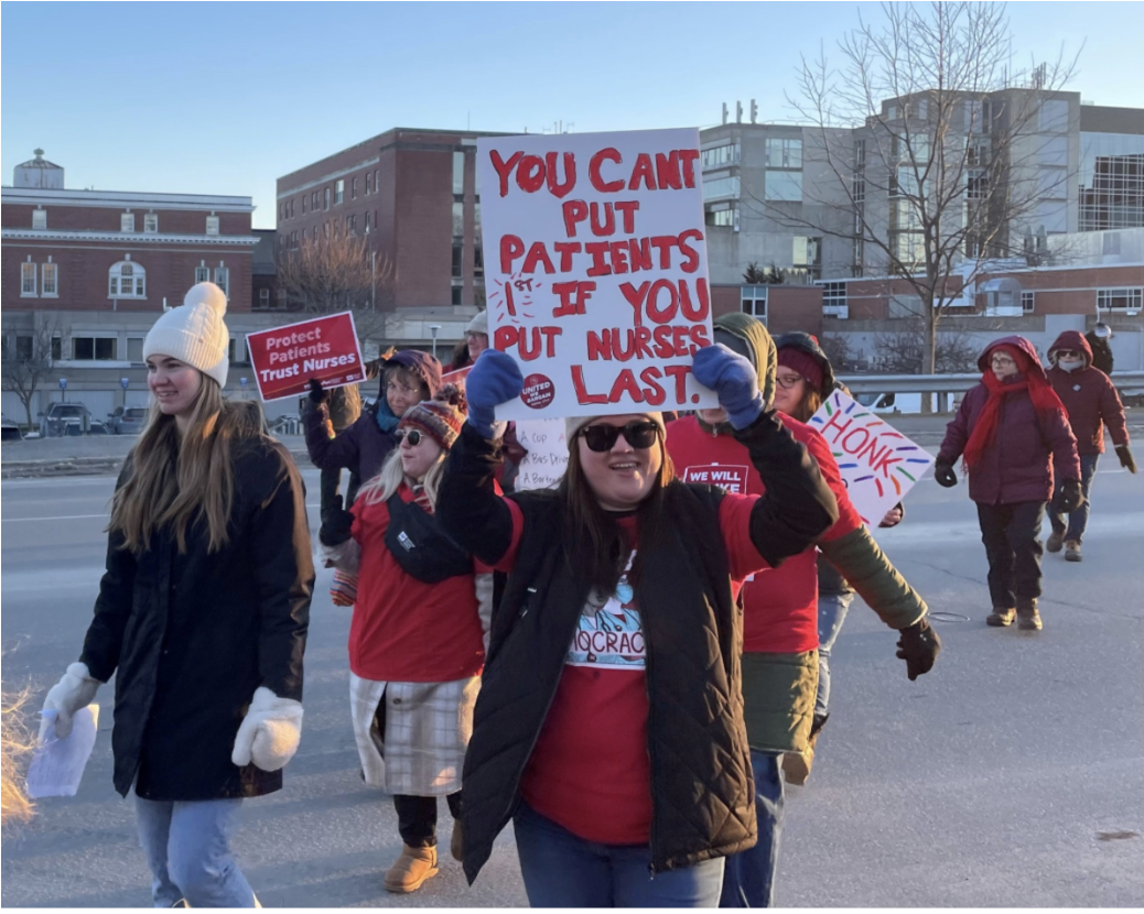 Registered nurses at Northern Light Eastern Maine Medical Center (EMMC) held a vigil and rally outside the hospital last week to highlight their demands for patient safety. The nurses, who are represented by Maine State Nurses Association/National Nurses Organizing Committee (MSNA/NNOC), picketed and chanted until sunset and then held a candlelight vigil. Many friends and community members joined the nurses in solidarity for better conditions for patients and nurses at EMMC.