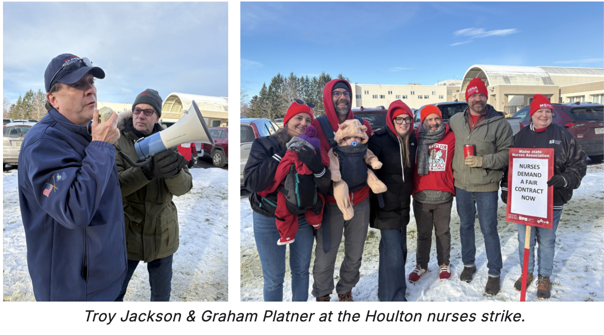 Dozens of nurses with the Maine State Nurses Association/NNU struck Houlton Regional Hospital on Tuesday and Wednesday to protest management’s refusal to improve staffing and patient safety. They were joined on the picket line by nurses from Northern Maine Medical Center in Fort Kent, Maine Medical Center in Portland and Eastern Maine Medical Center in Bangor as well as members of Teamsters Local 340 and the Orono Professional Firefighters (IAFF 3106). US Senate candidate Graham Platner and gubernatorial candidates Troy Jackson and Secretary of State Shenna Bellows also joined the picket.