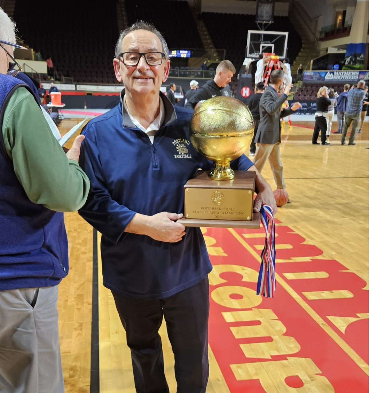 PHOTO: IATSE 114 member & Portland High School Boy's Basketball Assistant Coach Joe Giordano holding the State Class A Championship trophy.