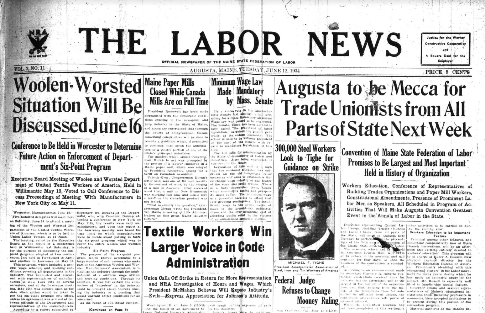 [caption caption="The front page from the old Maine AFL Labor News, June, 1934 edition." align="center"] [/caption] |
