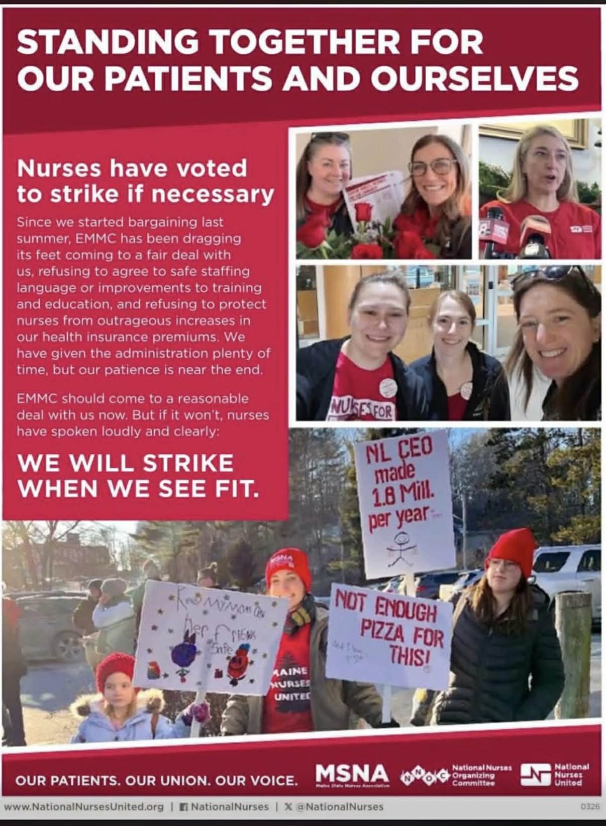 “Something has changed at EMMC,” said Jessie Lambert, RN and negotiating team member. “For most of the last decade, the administration of EMMC has worked with us every contract cycle to reach a fair and equitable union contract. But this time, they have taken an aggressive posture against us. They have refused to consider even our most common-sense proposals. Nurses’ patience is at an end and we’re ready to strike. Hopefully, EMMC will get serious at the table about safe staffing and maintaining our health benefits.”