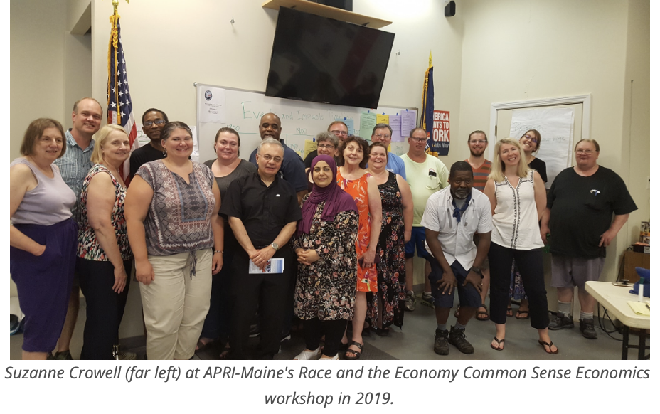 APRI-Maine has been growing and building power ever since, having just recently held a Juneteenth celebration in Windham with a record number of attendees. APRI member Ina Demers remembers Suzanne as someone who was never judgmental and taught her a lot about issues related to racial and economic justice.