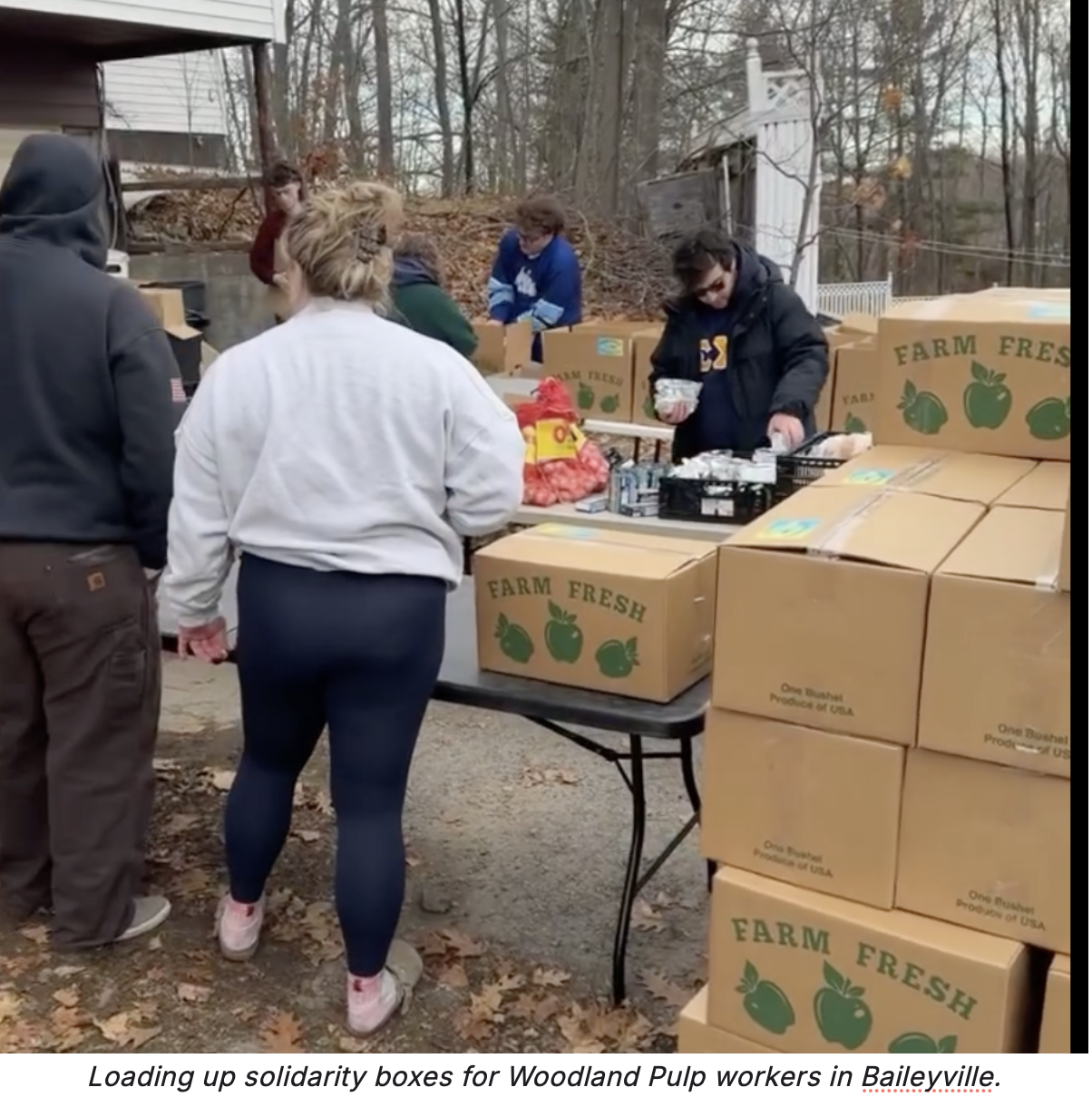 The volunteers also delivered 170 solidarity boxes to members of five different unions at Woodland Pulp and St. Croix Chipping who have been laid off while the mills are shut down for a month due to the soft pulp market. USW Local 27 President Shawn Howland said his members were very moved by the show of solidarity when the trucks arrived to deliver the boxes.
