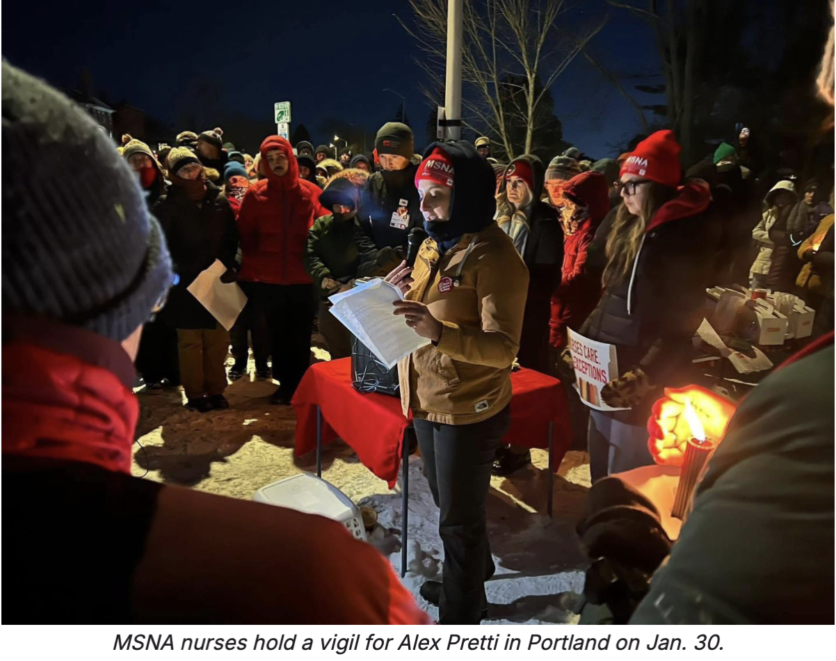 Registered union nurses from Maine Medical Center and Eastern Maine Medical Center held vigils last Friday to honor Alex Pretti, an RN who was slain by Customs and Border Protection officers in Minneapolis, Minn., as well as remember all who have been killed by federal immigration agents, and demand the abolition of ICE. 32 people died in ICE custody in 2025. The two vigils were organized by members of the Maine State Nurses Association.