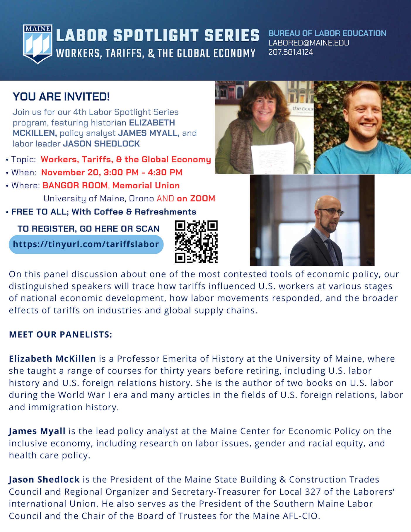 The Bureau of Labor Education will be holding a panel discussion titled "Workers, Tariffs, and the Global Economy on Thursday, November 20, 2025. The event is the fourth in the BLE's Labor Spotlight Series program.