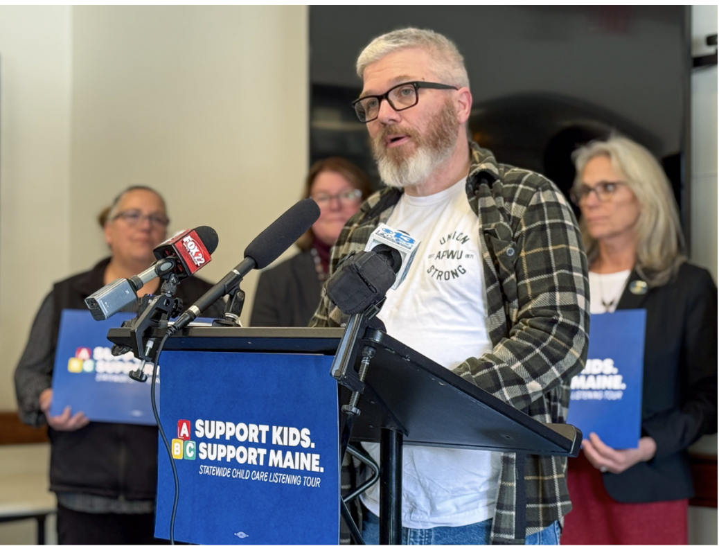 Speaking at a press conference Wednesday, American Postal Workers Union Local 458 member Kevin Ready of Lewiston talked about his own family’s struggles find affordable child care. He noted that full-time child care can easily cost $15,000 a year, putting this essential service out of reach for many workers.